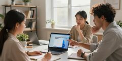 A modern office environment showcasing various email automation tools in use. In the foreground, a sleek laptop displays a colorful dashboard of email metrics and automation settings. Nearby, a smartphone shows notifications of scheduled emails, symbolizing seamless integration. In the middle ground, a diverse group of professionals in smart business attire are engaged in a collaborative discussion, pointing at the laptop screen with expressions of focus and excitement. The background features a large window with natural light streaming in, illuminating the space and creating an uplifting atmosphere. Soft shadows enhance the depth of the scene, utilizing a warm color palette to evoke a sense of productivity and innovation. The perspective is slightly angled to capture both the tools and the engaged users effectively, emphasizing a dynamic and modern approach to email management.